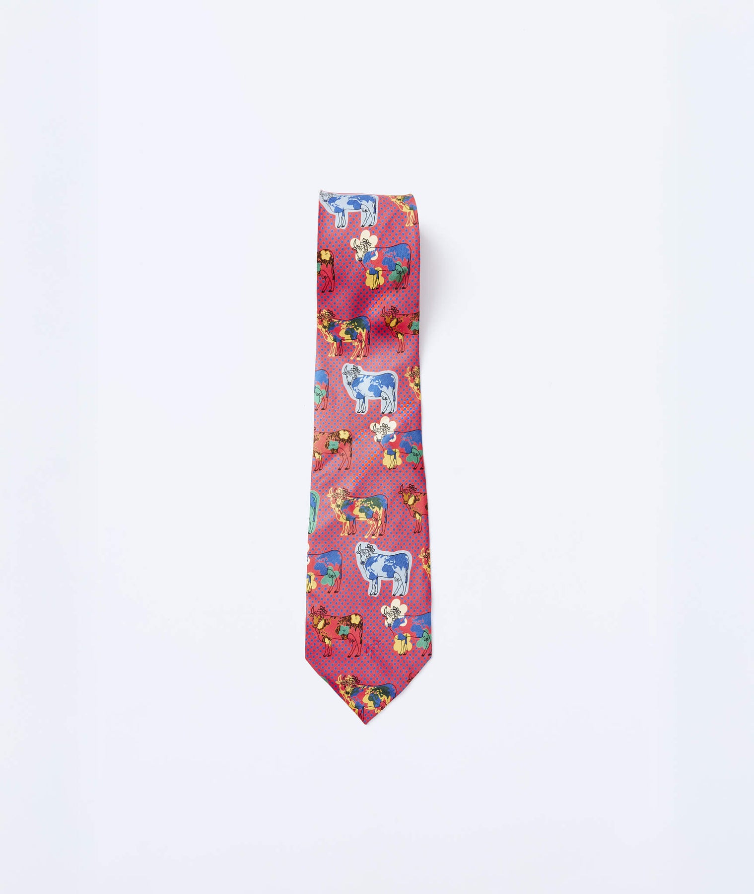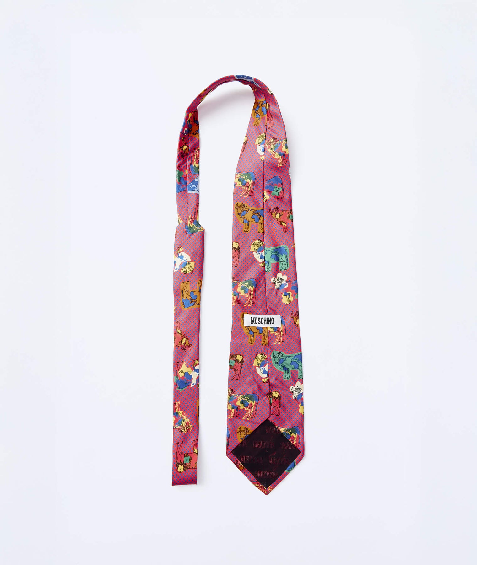 Bordo zemin üzerine mavi polka desen ve renkli inek baskılarıyla öne çıkan bu 90'lar Moschino ipek kravat, markanın ikonik mizah anlayışını tam anlamıyla yansıtan türden. Klasik bir parçaya beklenmedik bir karakter katarak görünümü tek hamlede dönüştürme gücüne sahip. Moschino'nun 90'ların başından itibaren kullandığı bu motif, yüksek moda ile gündelik semboller arasında kurduğu oyunlu dengeye küçük bir gönderme. Nadir bulunacak bu koleksiyonluk parça için benim olmalı diyorsan acele et.