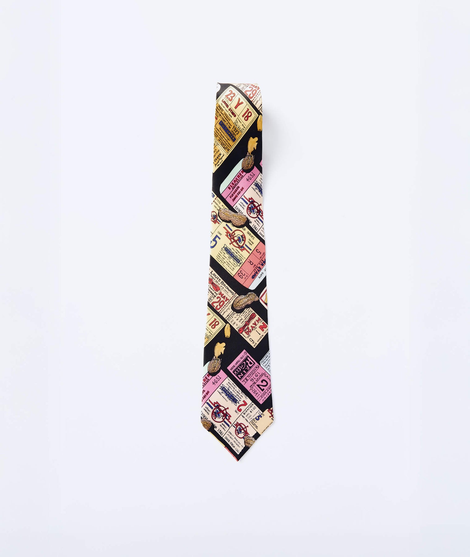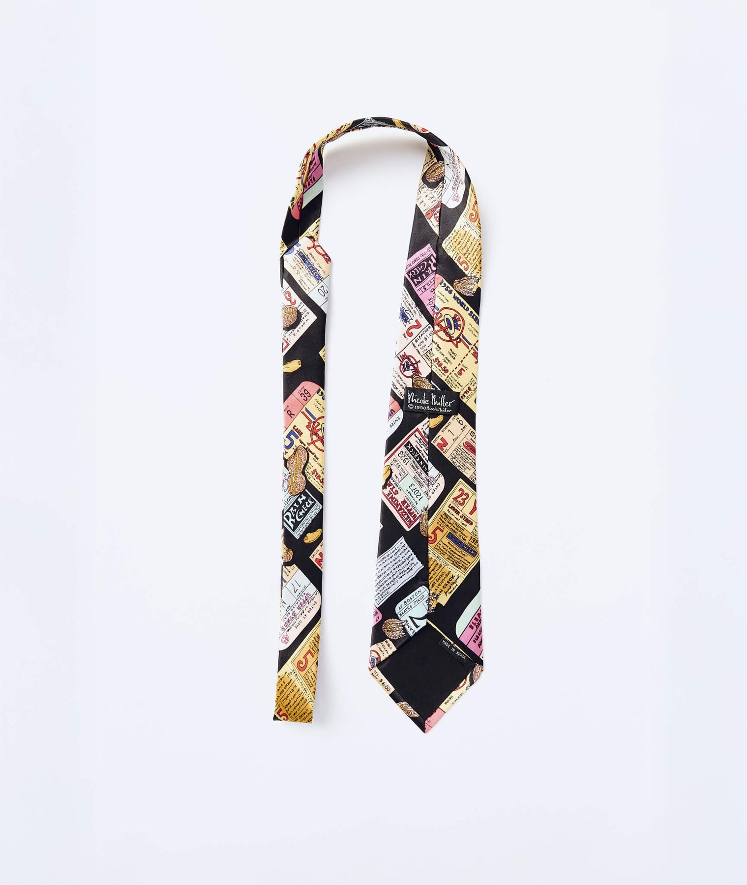 1990 yılına ait bu eğlenceli baskılara sahip Nicole Mille ipek kravat, markanın 1990'lardaki cool grafikler arasında gidip gelen özgün mizah anlayışının en iyi temsilcilerinden. Siyah üzerine renkli baskılarla hareketlenen bu özel parça en sade kombinini bile vurucu bir şekilde tamamlayacak türden.
