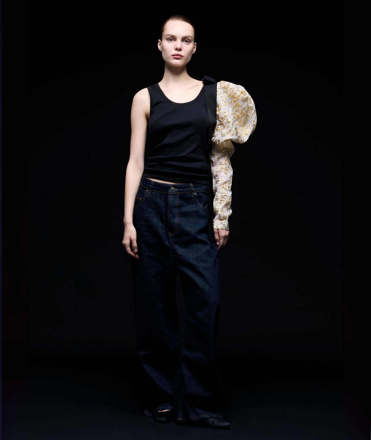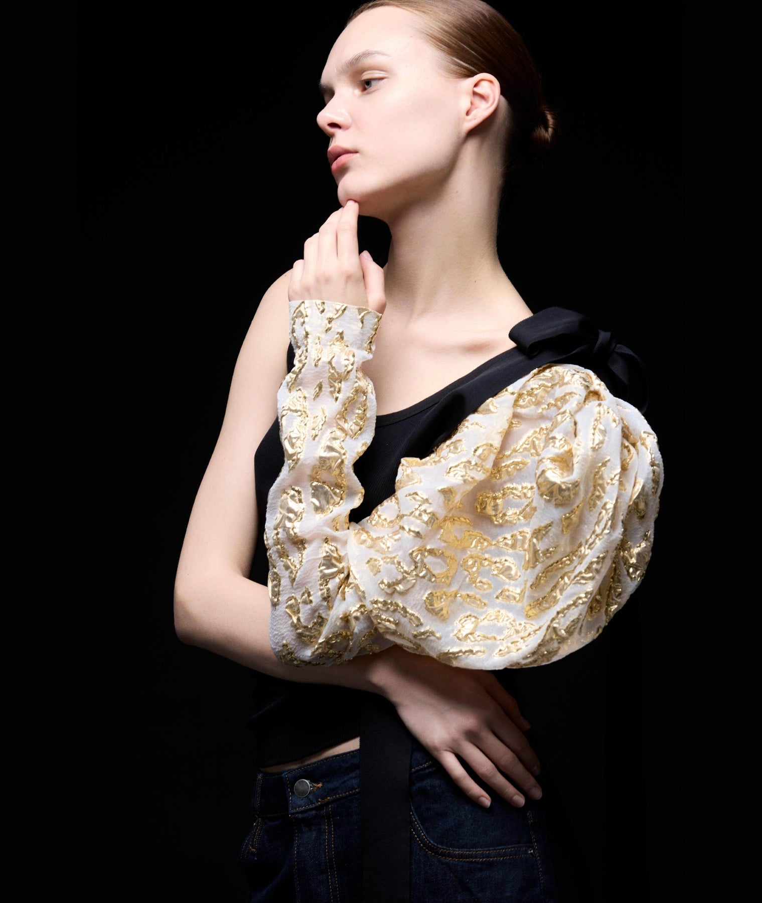 Altın desenli, dramatik balon koluyla dikkat çeken bu tek omuz Dries Van Noten bluz, hem heykelsi hem şiirsel bir siluet sunuyor. Leopar esintili jakar kumaşı ve hacimli kol detayı, tek omuz kesimiyle beklenmedik bir zarafet yaratıyor. Siyah saten kurdele omuzda feminen bir vurgu oluştururken, bluzun vücuda oturan formu modern ve iddialı bir denge kuruyor.
