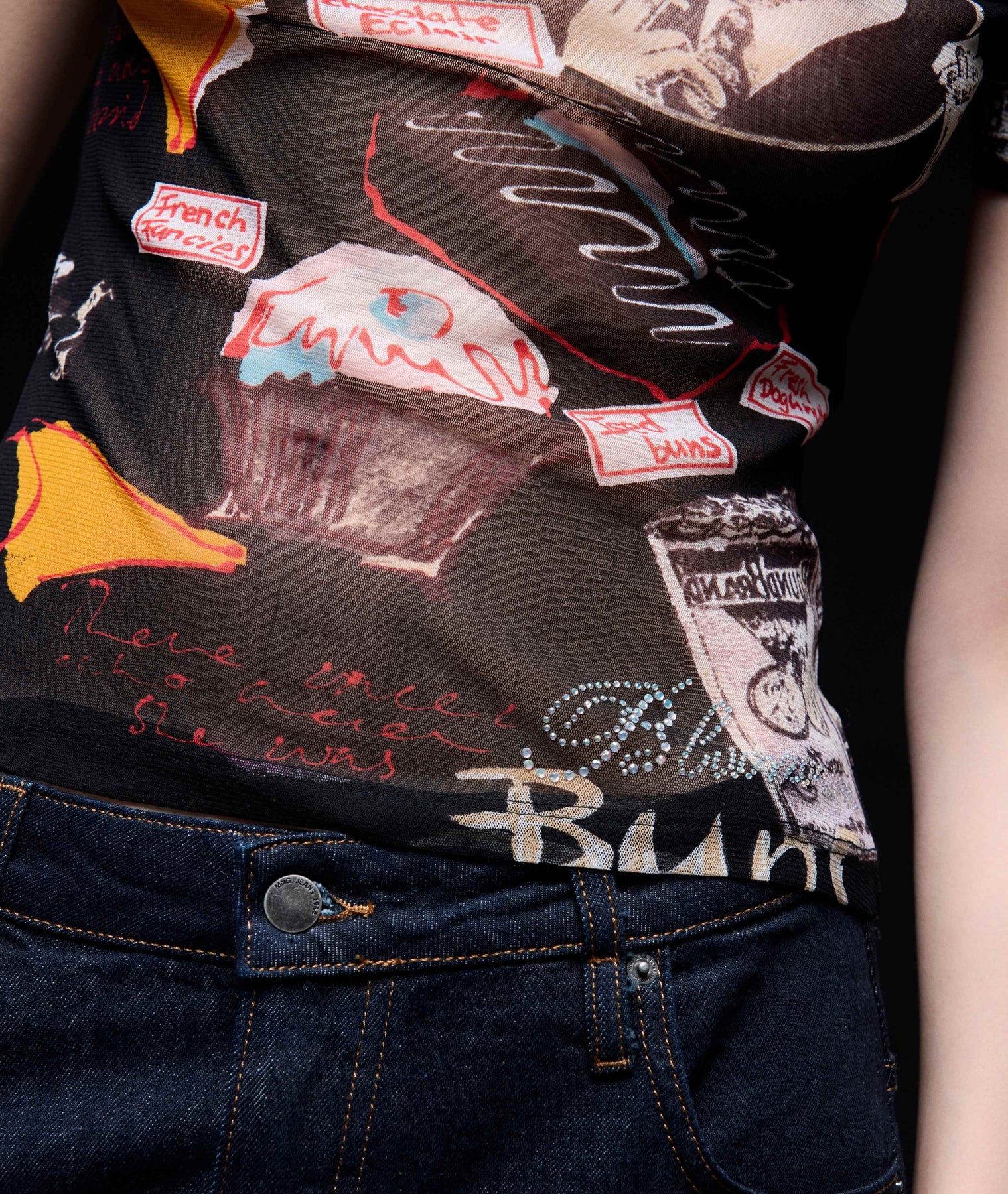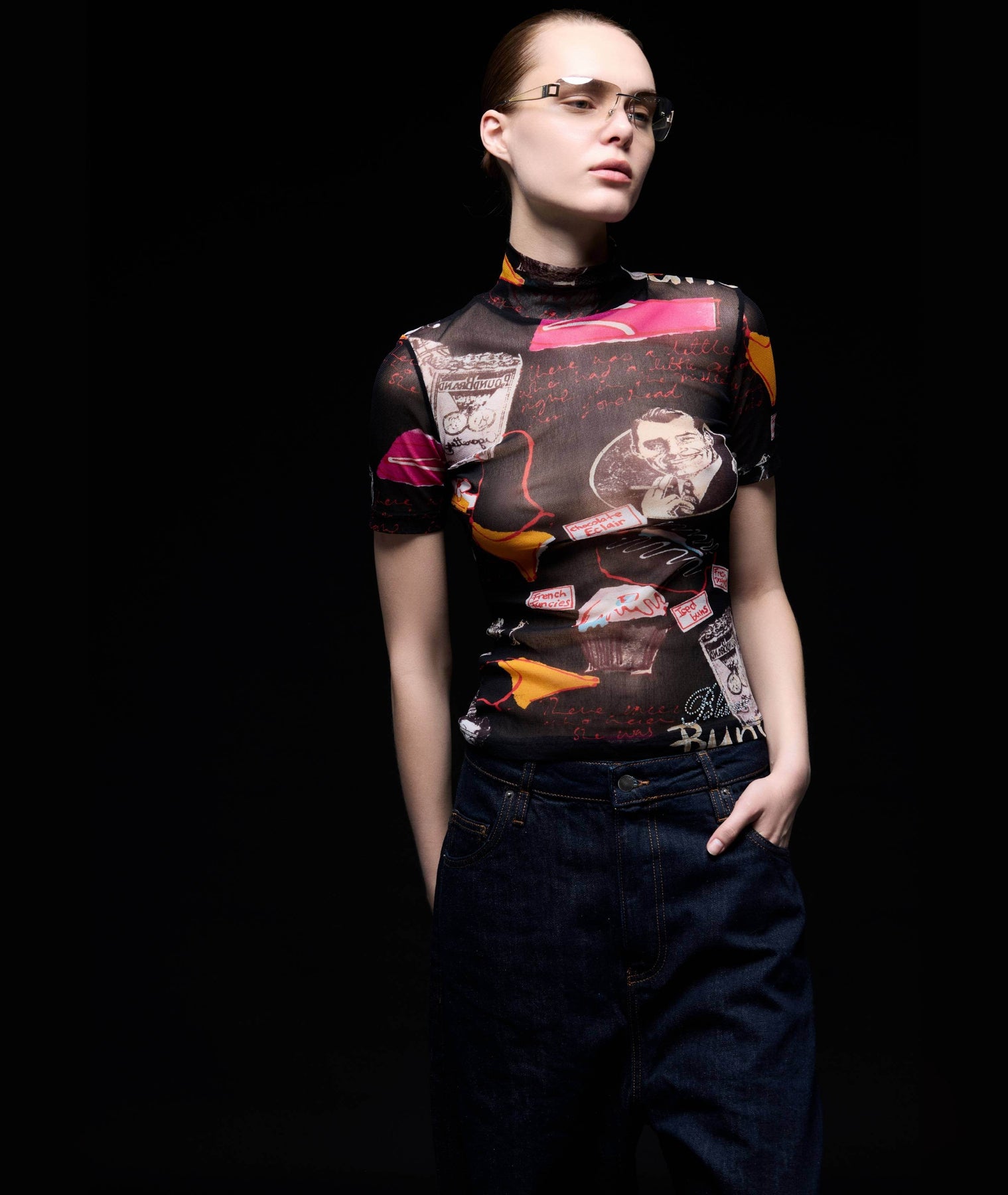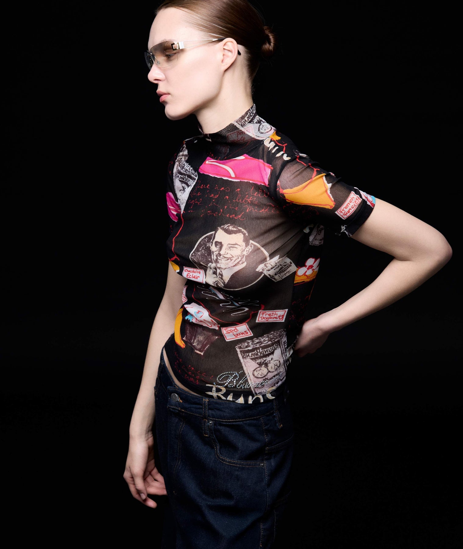 Transparan dokusu ve eğlenceli desenleriyle dikkat çeken bu Blumarine bluz, nostaljik poster estetiğiyle dikkat çekiyor. Etek ucunda taşlarla yazılmış logo detayı ise 2000’lerin enerjisini anımsatan zarif bir sürpriz. Dar kalıbıyla denim ya da oversize blazer’larla kolayca kombinlenebilecek bu eğlenceli parça tek başına veya içerisine uzun kollu bir üst ile de stiline farklı dokunuşlar katacak.